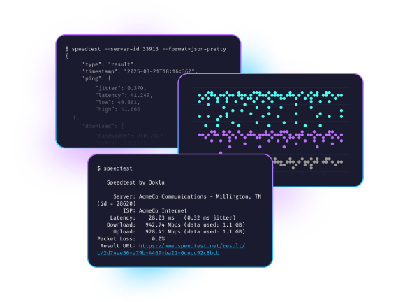 Speedtest CLIを使えば、 Speedtestで使われている信頼できるテクノロジーとグローバルサーバーネットワークをコマンドラインで使用できるようになります。